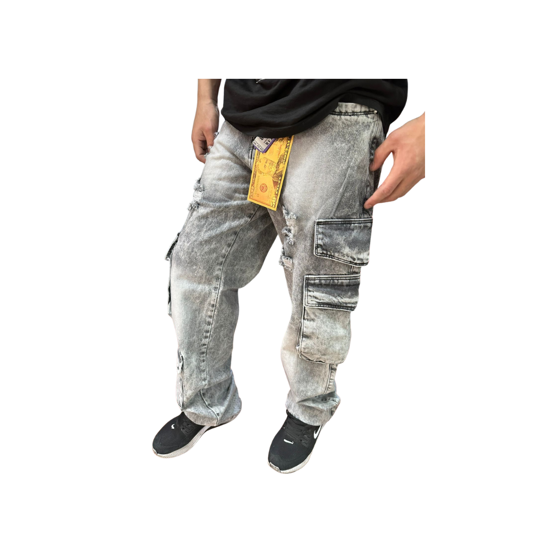 Acabado Rebelde: El pantalón incorpora roturas/rasgados estratégicamente ubicados (visibles en el área del muslo), reforzando su carácter rebelde y streetwear.